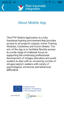 The PTIP Mobile Application is a fully functional training environment that provides access to all project's output, online Training Modules, Guidelines and Action Sheets. The aim of the App is to facilitate flexible access to a wide range of materials focus on supporting the continuing professional development of refugee educators and youth workers to deal with an increasing number of refuges/asylum seekers with variety of psychological, emotional and behavioral difficulties.